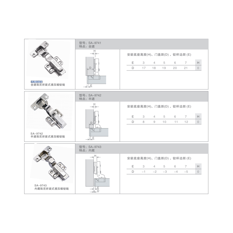 产品名称:拆装阻尼暗铰链 适用范围:适用各类柜门 主要材质:冷轧钢 铰杯深度:11 精品福利视频. 5mm 铰杯直径:Φ35mm 面板(E)尺寸:3-7mm 门板厚度:14-21mm 开启角度:105° 最大承重:2只/8KG 主要功能:内置阻尼装置和自闭装置 主要特点:快拆装式 .