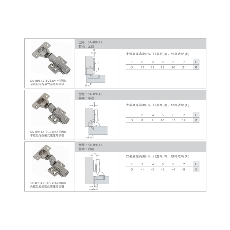 产品名称:SUS304不锈钢拆装阻尼暗铰链 适用范围:适用各类柜门 主要材质:304不锈钢 铰杯深度:11. 5mm 铰杯直径:Φ35mm 面板(E)尺寸:3-7mm 门板厚度:14-21mm 最大承重:2只/8KG 主要功能:内置阻尼装置和自闭装置 主要特点:快拆装式 精品福利视频.