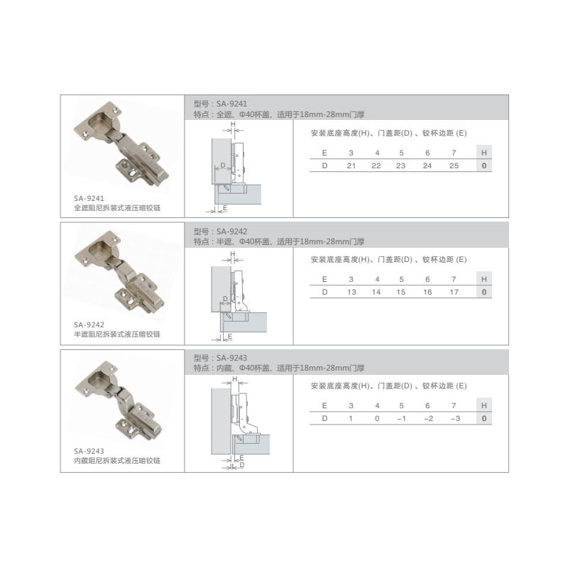 产品名称:拆装阻尼暗铰链 适用范围:适用各类柜门 主要材质:冷轧钢 铰杯深度:11 精品福利视频. 5mm 铰杯直径:Φ40mm 面板(E)尺寸:3-7mm 门板厚度:18-25mm 开启角度:105° 最大承重:2只/8KG 主要功能:内置阻尼装置和自闭装置 主要特点:快拆装式 .